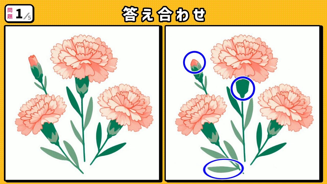 回答2:下部 一番左のカーネーションの枝に葉が一枚増えています。
