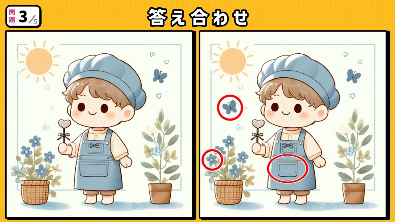 第3問 青い帽子とエプロンを付けた子供と植木