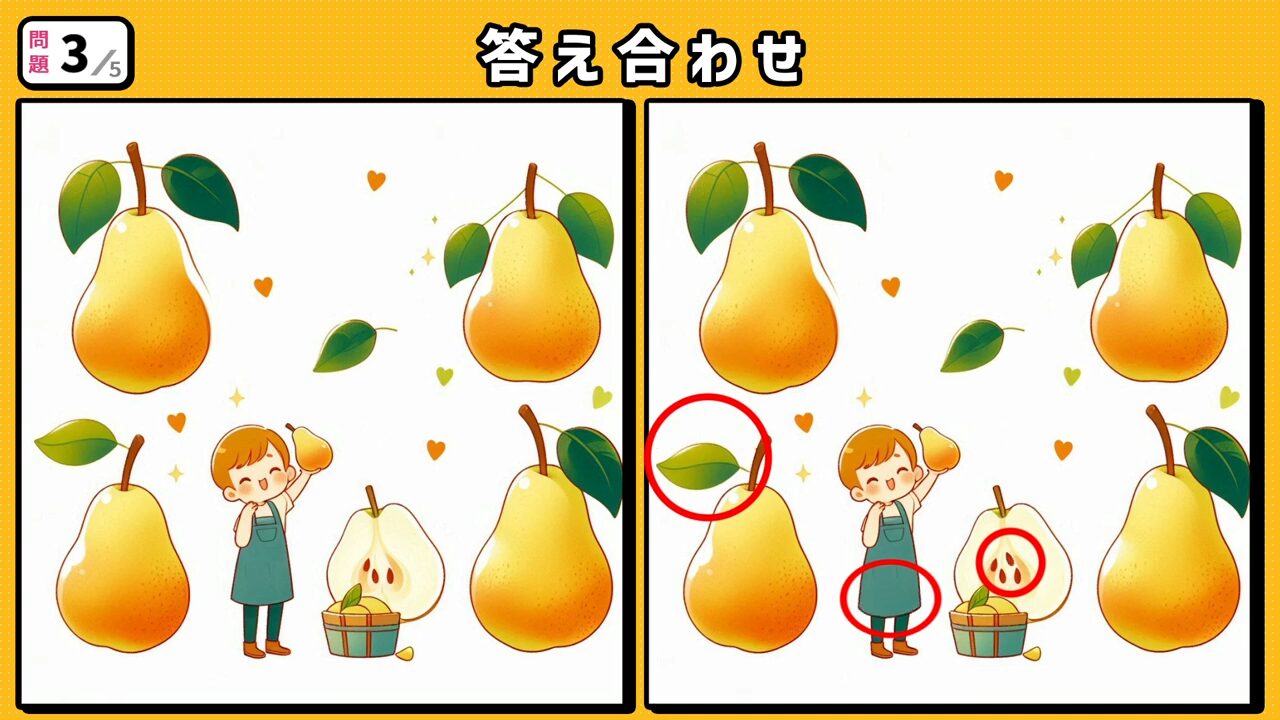 回答3:右側 半分に切った洋梨の種が1粒増えています。